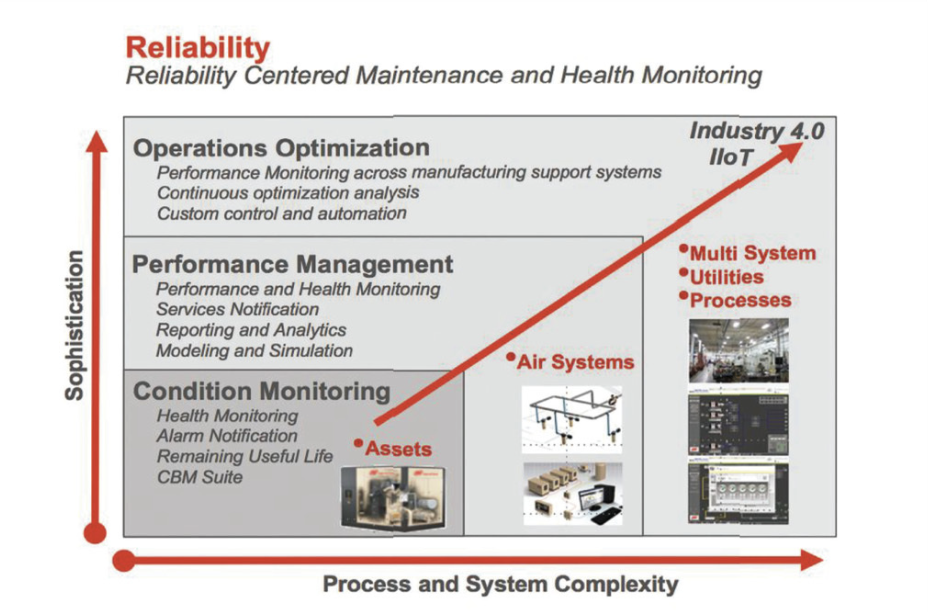 With a total system approach to condition-based maintenance, facilities can improve efficiency by monitoring and storing data in the cloud to see how all of the air system components work together. Visibility into the interaction between the system components helps to predict exact maintenance intervals – there’s no guessing involved. From consumables to key parts like rotors, all the way to the end at the point-of-use, digital connectivity provides operators insight into every step of the process. This level of monitoring, through system design and diagnostics, enables plants to maintain higher levels of reliability, often called “reliability centered maintenance” (RCM).