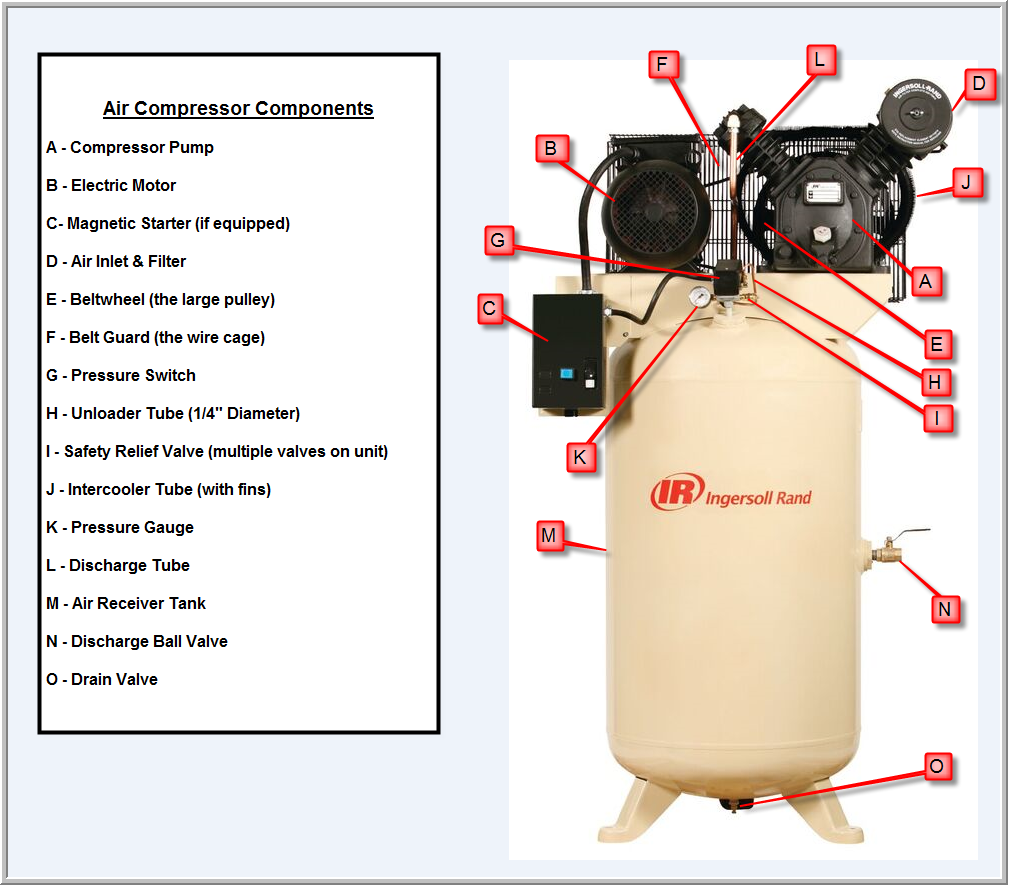 Please see the image below for the names of the various parts used to build an Ingersoll Rand air compressor.