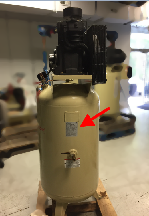 The reciprocating air compressor product models built at the Ingersoll Rand factory located in Campbellsville, KY (USA) have a silver decal affixed to the air receiver tank that displays identifying data applicable to that compressor. This decal is typically located near the discharge port on the tank.