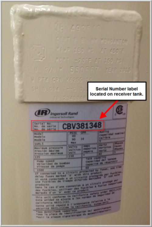NOTE - The serial number located on the tag affixed to the black, cast iron compressor pump is for the pump only. Ingersoll Rand does not use this serial number to identify the compressor.