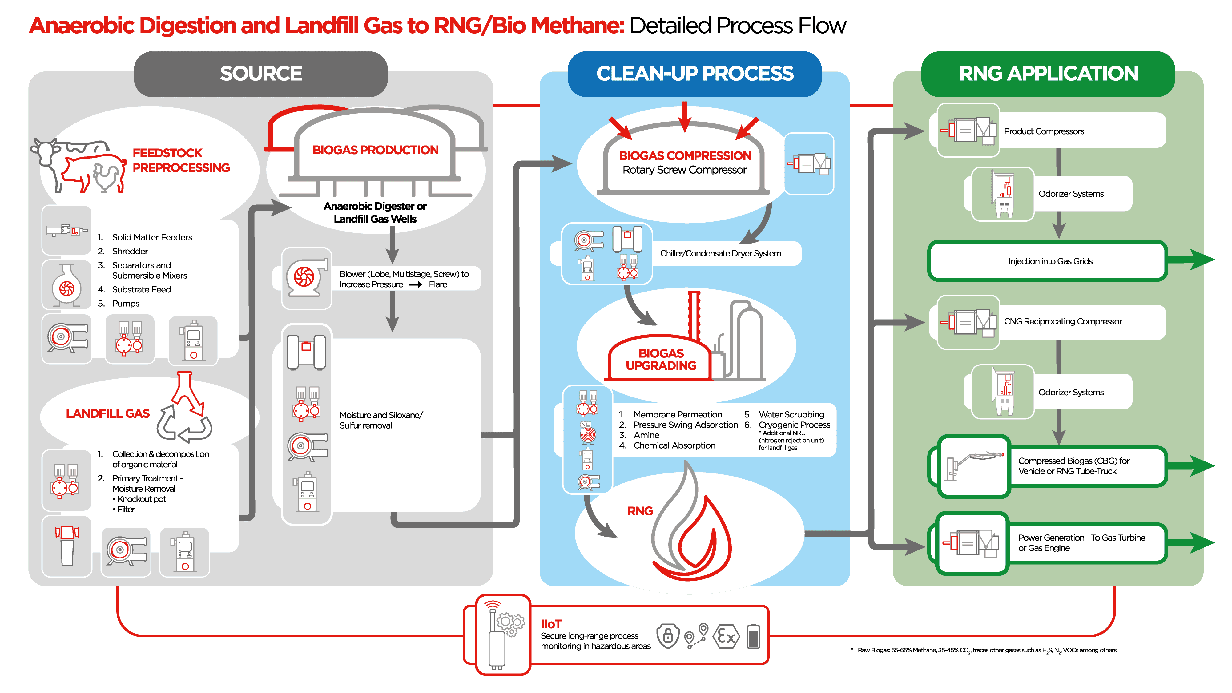 In its commitment to a carbon neutral future, Ingersoll Rand offers a wide range of solutions supporting various stages of the RNG process. This includes natural gas compressors, blowers, and vacuum solutions for extraction, as well as pumps, loading arms and odorization systems with integrated specialized IIoT systems for remote monitoring.
